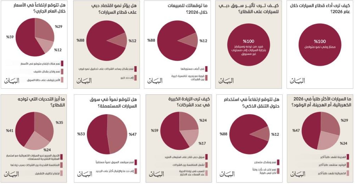 100 % على سؤال «كيف ترى أداء قطاع السيارات خلال عام 2026» بالقول «ممتاز وفي نمو متواصل».
