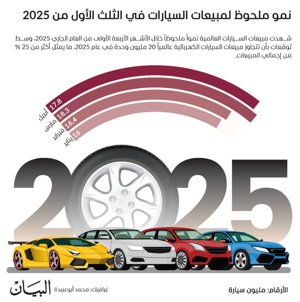 شهدت مبيعات السيارات العالمية نمواً ملحوظاً خلال الأشهر الأولى من عام 2025، وسط توقعات بأن تتجاوز مبيعات السيارات الكهربائية عالمياً 20 مليون وحدة في عام 2025، ما يمثل أكثر من 25 % من إجمالي المبيعات.