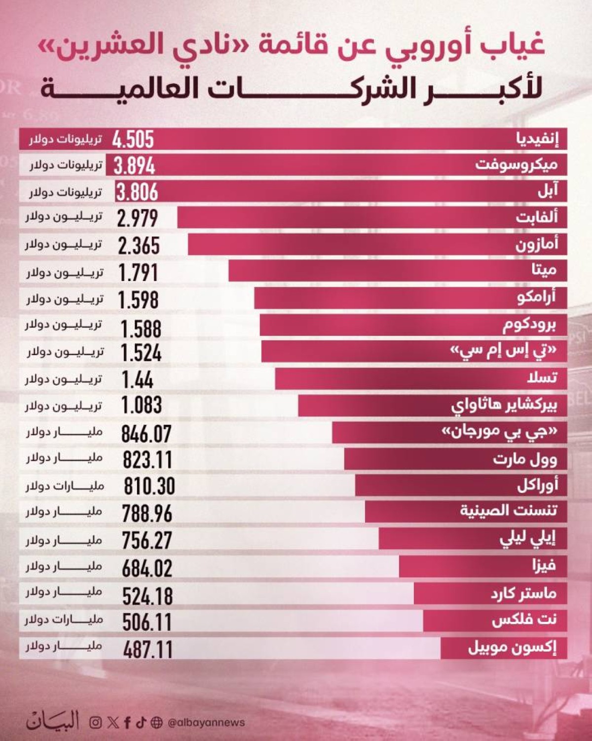 اجتاحت صورة لقائمة عن أكبر الشركات في العالم منصات التواصل الاجتماعي لتتفوق على كل التحليلات الاقتصادية المطولة، جدول بسيط يعرض أسماء أكبر 20 شركة في العالم من حيث القيمة السوقية، وباستثناء ثلاث شركات من شرق آسيا هيمنت الولايات المتحدة على القائمة، بينما غاب أي اسم أوروبي منها تماماً. لم يكن ذلك خطأ مطبعياً، بل إشارة رمزية إلى لحظة تحول في التاريخ المالي العالمي، حيث أعاد سباق الذكاء الاصطناعي رسم قمة الهرم الاقتصادي.