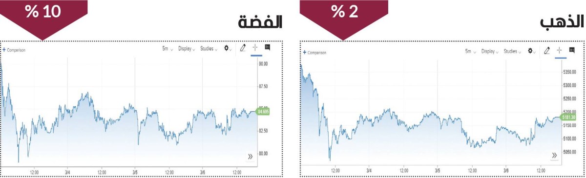 كما تراجعت الفضة بنسبة 10 % إلى 84.33 دولاراً للأوقية نزولاً من 93.82 دولاراً للأوقية. وسجل مؤشر الدولار أكبر ارتفاع أسبوعي له منذ عام تقريباً، في ظل دعم الاضطرابات في منطقة الشرق الأوسط الطلب على أصول الملاذ الآمن.