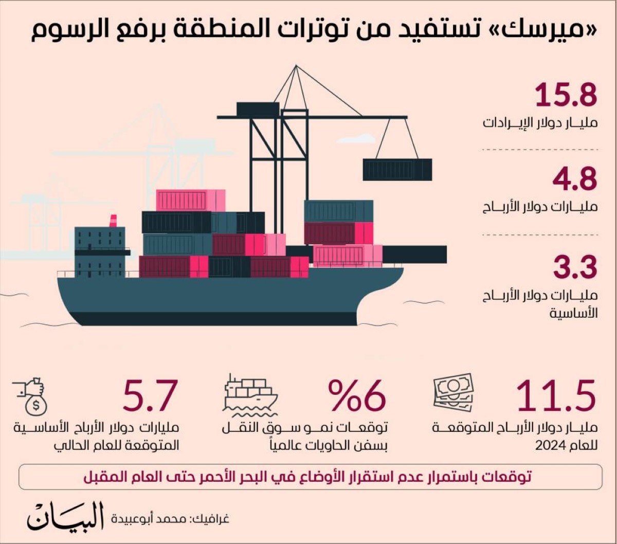 رفعت شركة «إيه بي مولر-ميرسك»، التي تعدّ بمثابة مؤشر رئيسي لحركة التجارة العالمية، توقعاتها السنوية للأرباح للمرة الرابعة في أقل من 6 أشهر، مستندة إلى ارتفاع الطلب وزيادة أسعار الشحن نتيجة اضطرابات سلاسل التوريد في البحر الأحمر.