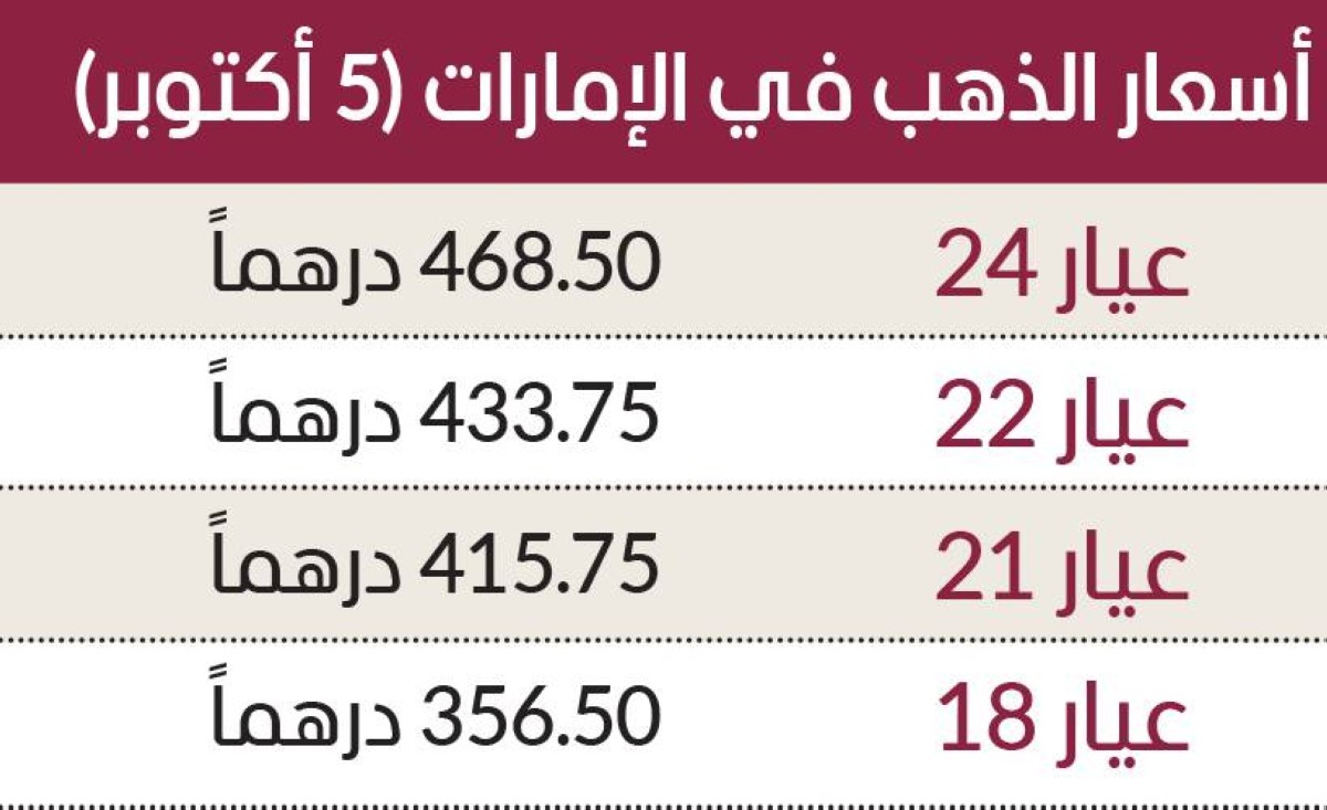 واستقرت أسعار الذهب في الإمارات، الأحد، حيث وصل سعر الذهب «عيار 24» إلى 468.50 درهماً، فيما وصل سعر «عيار 22» إلى 433.75 درهماً، فيما سجل الذهب «عيار 21» إلى 415.75 درهماً، و«عيار 18» إلى 356.50 درهماً.
