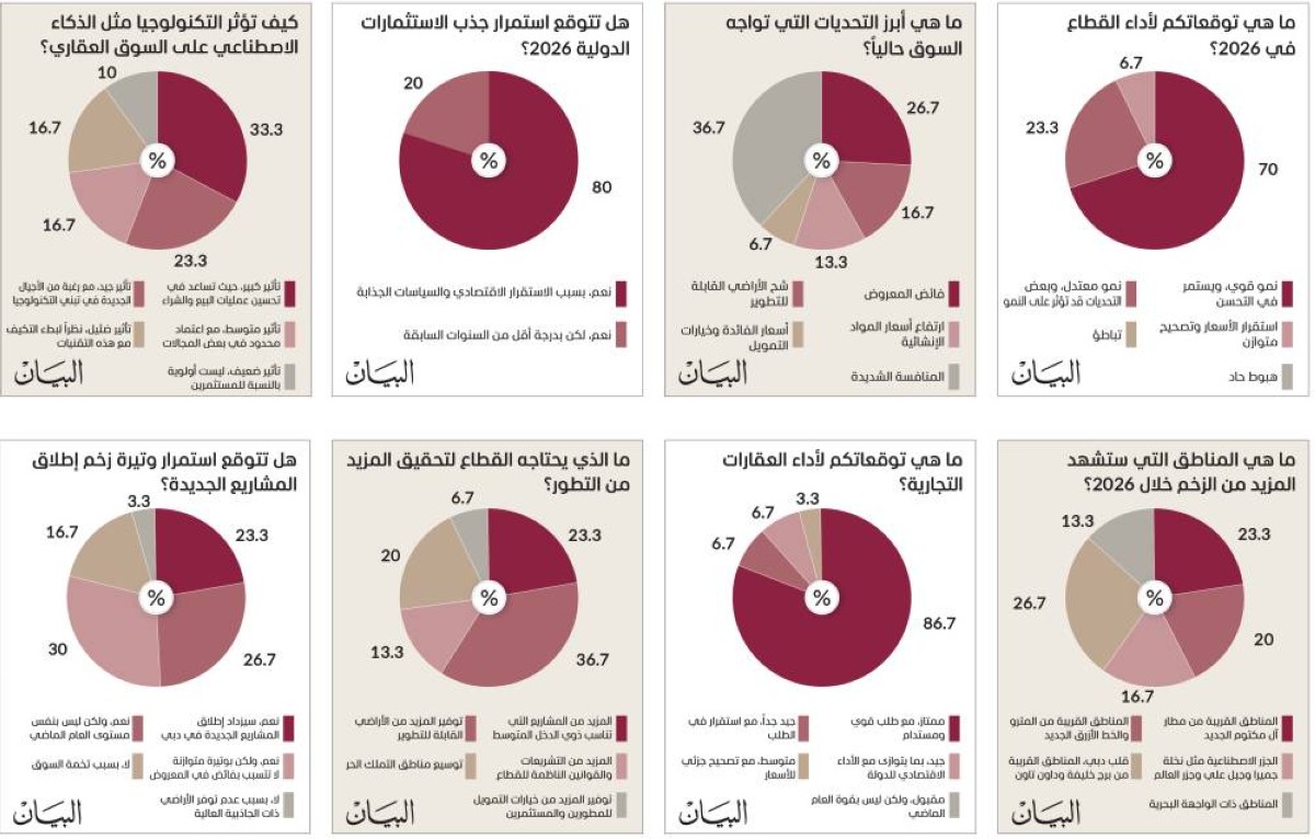 ويعكس الاستبيان، الذي شمل أكثر من 30 مسؤولاً ومطوراً وخبيراً في القطاع العقاري بدبي، إجماعاً مهنياً نادراً على متانة السوق خلال 2026، مع غياب أي سيناريوهات سلبية حادة، ففي الوقت الذي يتوقع فيه معظم المشاركين استمرار النمو، يظهر وعي متقدم بالتحديات المرتبطة بالمنافسة وإدارة المعروض، ما يشير إلى سوق أكثر نضجاً، يقوده التخطيط طويل الأمد، وتوازن العرض والطلب، وتبنٍّ تدريجي للتكنولوجيا، بما يدعم استدامة النمو العقاري في الإمارة.