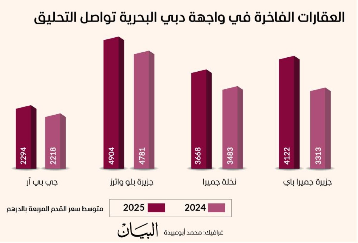 وسجلت جزيرة جميرا باي نمواً ملحوظاً في الأسعار بنسبة 24% على أساس سنوي، مما أدى إلى اتجاه أوسع في المجتمعات الساحلية المرغوبة مثل نخلة جميرا، وجزيرة بلوواترز، وجميرا بيتش ريزيدنس، وتشير البيانات إلى استمرار الطلب على السكن الفاخر على شاطئ البحر، مدفوعاً بندرة المساكن، والاهتمام الدولي، والتحول نحو الاستثمار القائم على نمط الحياة.