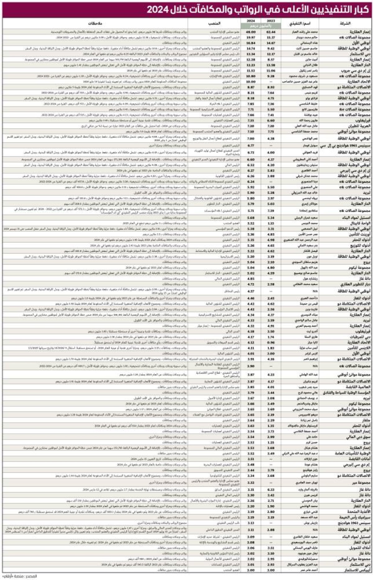 كما جاء في المرتبة الرابعة الرئيس التنفيذي والعضو المنتدب جاسم حسين ثابت لشركة أبوظبي الوطنية للطاقة الذي تقاضى رواتب وبدلات ومزايا أخرى بقيمة 14.74 مليون درهم خلال عام 2024، تبعه في المرتبة الخامسة خالد جاسم بن كلبان نائب رئيس مجلس الإدارة وكبير المسؤولين التنفيذيين لشركة دبي للاستثمار بحصوله على مجموع الرواتب والبدلات ومكافآت بـ13.34 مليون درهم خلال عام 2024.