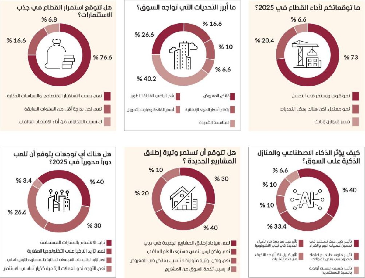 وتوقع 73% من المشاركين أن يشهد القطاع العقاري بدبي في 2025 نمواً قوياً مع توقعات باستمرار التحسن خلال الأشهر المقبلة، فيما توقع 20.4% من أفراد العينة أن يسجل السوق نمواً معتدلاً مع وجود بعض التحديات التي قد تؤثر على النمو، بالمقابل أشار 6.6% من المشاركين إلى أن الأداء سيكون ثابتاً متوازناً خلال العام الجاري.