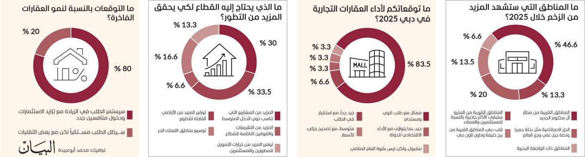 وتوقع 83.5% من المشاركين في الاستبيان أن يكون أداء العقارات التجارية ممتازاً خلال 2025 مع طلب قوي ومستدام، فيما توقع 6.6% من أفراد العينة أداءً جيداً جداً، مع استقرار في الطلب، 3.3% توقعوا أداءً جيداً، بما يتوازى مع الأداء الاقتصادي للدولة، و3.3% توقعوا أداءً متوسطاً، مع تصحيح جزئي للأسعار، فيما يرى 3.3% من المشاركين أن يكون الأداء مقبولاً، ولكن ليس بقوة العام الماضي.