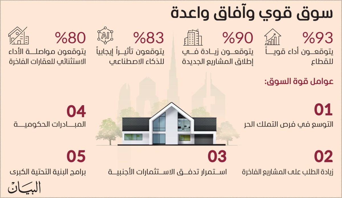 وأظهرت النتائج تفاؤلاً كبيراً بأداء سوق دبي العقاري، مدعوماً بعوامل عدة، من بينها التوسع في فرص التملك الحر في المناطق الاستراتيجية، وزيادة الطلب على المشاريع الفاخرة، واستمرار تدفق الاستثمارات الأجنبية، كما أشارت النتائج إلى أن المبادرات الحكومية مثل «أجندة دبي الاقتصادية D33» وبرامج البنية التحتية الكبرى تعد محفزاً رئيساً لدفع عجلة النمو العقاري، مما يعزز مكانة دبي وجهة مفضلة للاستثمار العقاري على مستوى العالم.