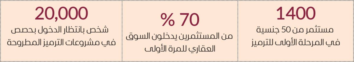 وأضاف أن نحو 70 % من هؤلاء المستثمرين يدخلون السوق لأول مرة، وأن هناك أكثر من 20 ألف شخص على قائمة الانتظار تقدموا للدخول بحصص في مشروعات الترميز.