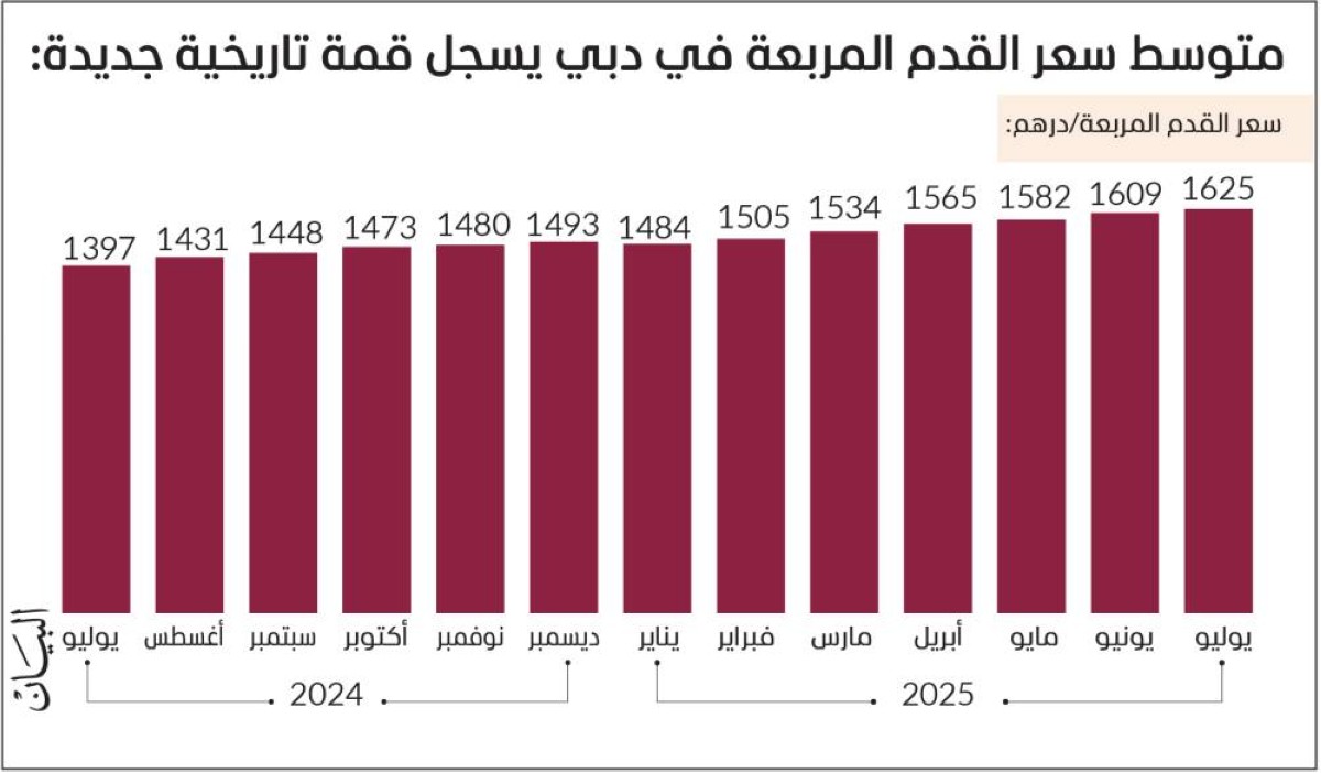 يواصل السوق العقاري بدبي أداءه القياسي منذ مطلع عام 2025، حيث سجل متوسط سعر القدم المربعة في دبي، قمة تاريخية جديدة، بلغت 1625 درهماً في يوليو الماضي، محطماً بذلك الرقم القياسي المسجل في يونيو 2025، عند 1609 دراهم، ويعتبر الرقم المسجل في يوليو، أعلى ذروة سعرية للسوق على الإطلاق، في مؤشر واضح على الزخم القوي الذي يشهده القطاع العقاري في الإمارة.