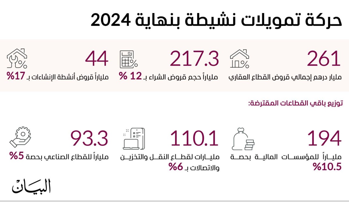 من جهة أخرى، بلغت حصة اقتراض قطاع النقل والتخزين والاتصالات ما نسبته 6 % من إجمالي اقتراض المقيمين برصيد تراكمي بلغ 110.1 مليارات درهم في نهاية 2024 مرتفعة بقيمة 18.4 مليار درهم إضافية وبنسبة 20 % مقارنة بإجمالي رصيد تراكمي بلغ 91.7 مليار درهم ديسمبر 2023.
