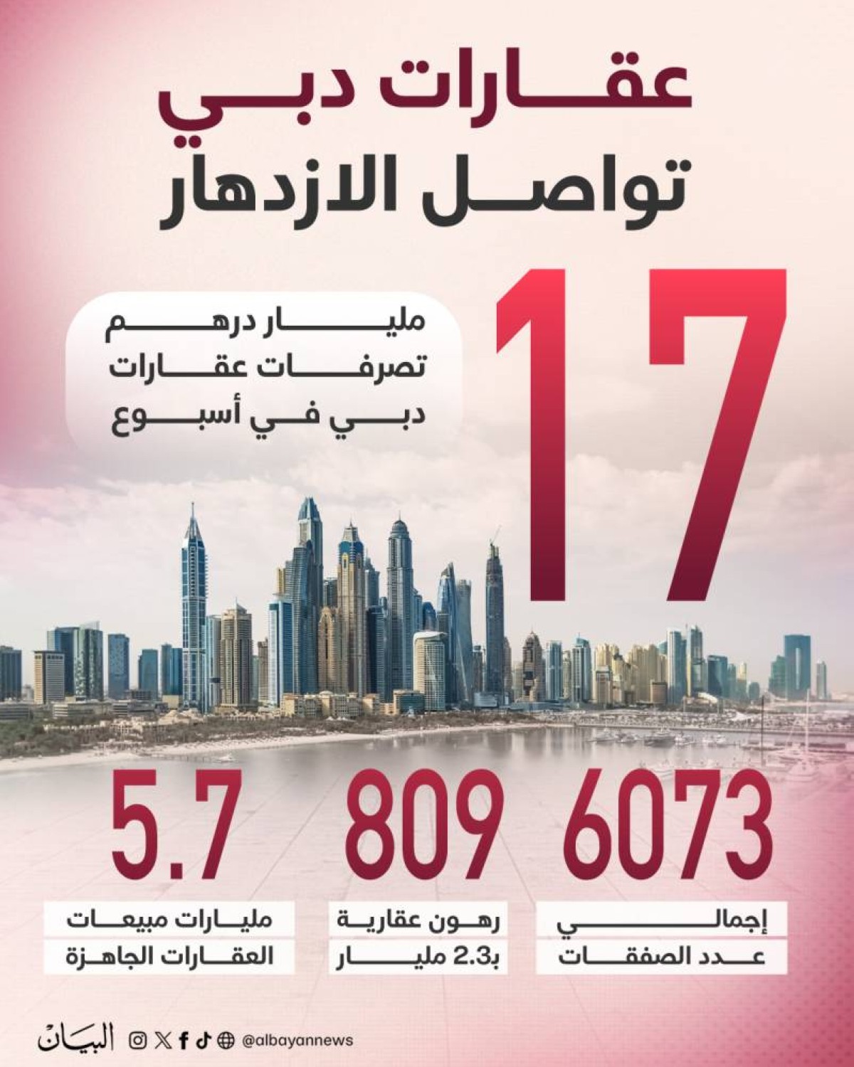 سجلت التصرفات العقارية في دائرة الأراضي والأملاك بدبي، الأسبوع الماضي، 16.8 مليار درهم، نتجت عن 6073 صفقة، وشهدت الدائرة تسجيل أكثر من 5066 مبايعة بقيمة 13.7 مليار درهم، و809 صفقات رهون عقارية بقيمة 2.3 مليار درهم، كما سُجل 198 معاملة هبة بقيمة 867 مليون درهم.