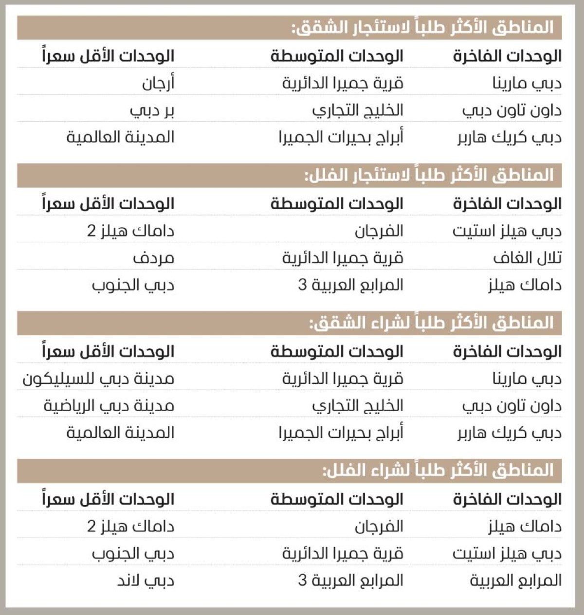 في المقابل، أظهر الباحثون عن عقارات ضمن فئة الأسعار المتوسطة، اهتماماً كبيراً بمناطق «قرية جميرا الدائرية» و«الخليج التجاري» و«الفرجان» و«المرابع العربية 3»، في حين واصلت مناطق «دبي مارينا» و«داون تاون دبي» و«داماك هيلز» و«دبي هيلز استيت»، جذب الباحثين عن عقارات فاخرة.