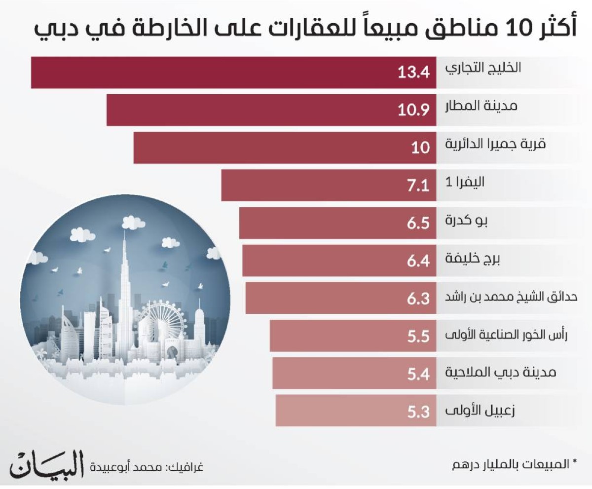 وحافظت منطقة الخليج التجاري على صدارة مبيعات دبي العقارية على الخارطة خلال الأشهر العشرة الأولى من العام الجاري، حيث سجلت مبيعات بقيمة 13.4 مليار درهم نتجت عن 5376 صفقة، وحلت ثانياً منطقة مدينة المطار بقيمة 10.9 مليارات درهم نتجت عن 3964 صفقة.