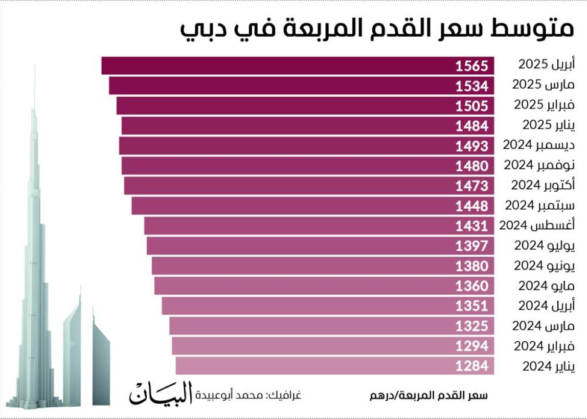 سجّل متوسط سعر القدم المربعة في دبي قمة تاريخية جديدة، حيث بلغ 1565 درهماً في أبريل الماضي، محطماً بذلك الرقم القياسي المسجل في مارس 2025 عند 1534 درهماً، ويعتبر الرقم المسجل في أبريل أعلى ذروة سعرية للسوق على الإطلاق، في مؤشر واضح على الزخم القوي، الذي يشهده القطاع العقاري في الإمارة.