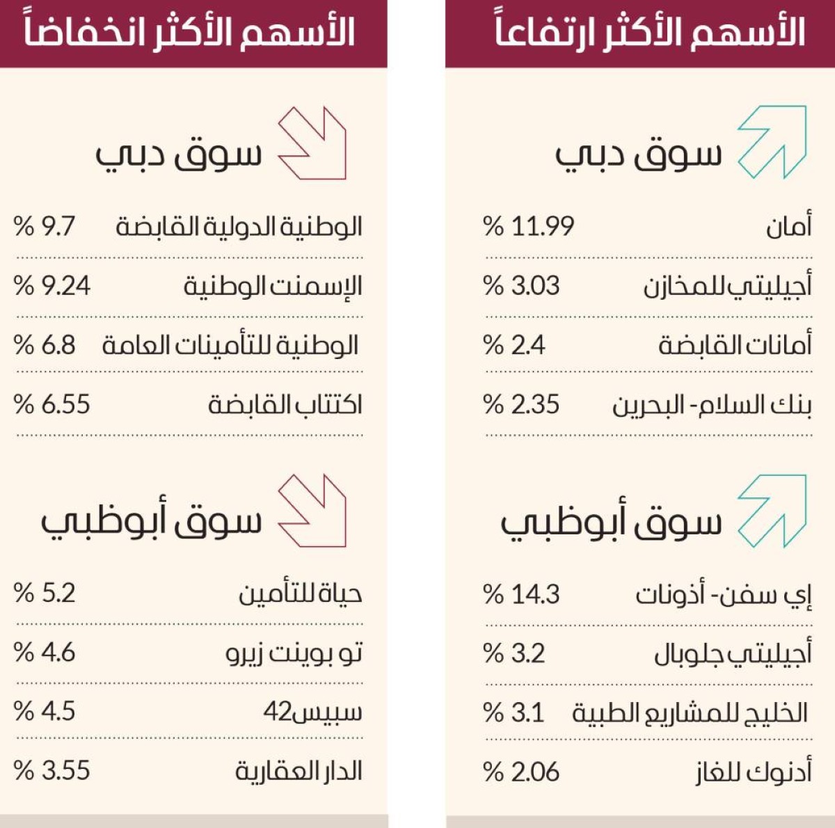 وتصدر سهم «أمان» ارتفاعات 12 شركة بسوق دبي مرتفعاً 11.99%، وصعدت أسهم أجيليتي للمخازن 3.03%، وأمانات القابضة 2.4%، وبنك السلام- البحرين 2.35%، فيما انخفضت أسهم الوطنية الدولية القابضة 9.7%، والإسمنت الوطنية 9.24%، والوطنية للتأمينات العامة 6.8%، واكتتاب القابضة 6.55%.