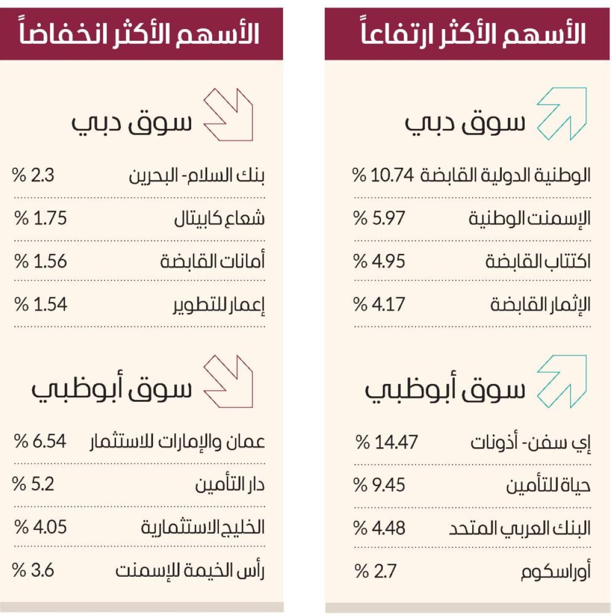 وارتفعت في سوق أبوظبي أسهم إي سفن- أذونات 14.47% بالحد الأقصى، وحياة للتأمين 9.45%، والبنك العربي المتحد 4.48%، وأوراسكوم 2.7%.