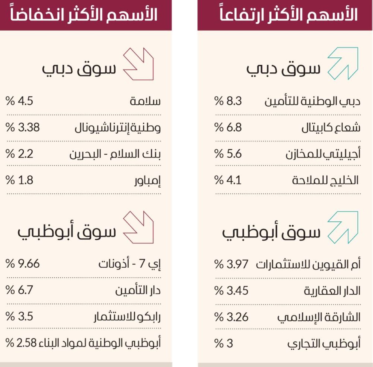 في المقابل، انخفضت أسهم إي 7 - أذونات 9.66%، ودار التأمين 6.7%، ورابكو للاستثمار 3.5%، وأبوظبي الوطنية لمواد البناء 2.58%.