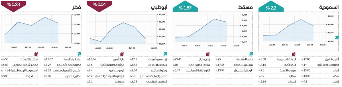 وفي سلطنة عمان، أنهى المؤشر الرئيسي لبورصة مسقط «مسقط 30» تعاملات الأسبوع، بارتفاع بنسبة 1.87% إلى النقطة 6330.27، وذلك بدعم من ارتفاع جماعي للمؤشرات القطاعية.