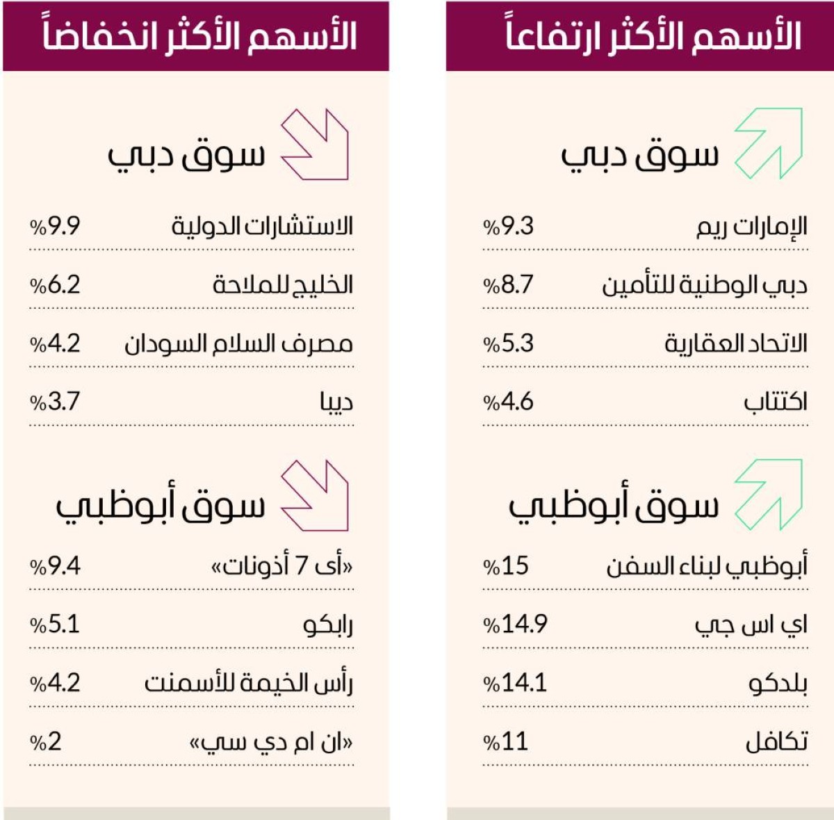 في المقابل فقد كان سهم مجموعة «اي 7 أذونات» بمقدمة الأسهم المتقلصة بنسبة 9.4% ثم سهم «رابكو» بنسبة 5.1% فيما تراجع سهم «رأس الخيمة للأسمنت» بنسبة 4.2% بينما تقلص سهم شركة «أي 7» أيضا بنسبة 3.5% و«ان ام دي سي جروب» بنسبة 2%.