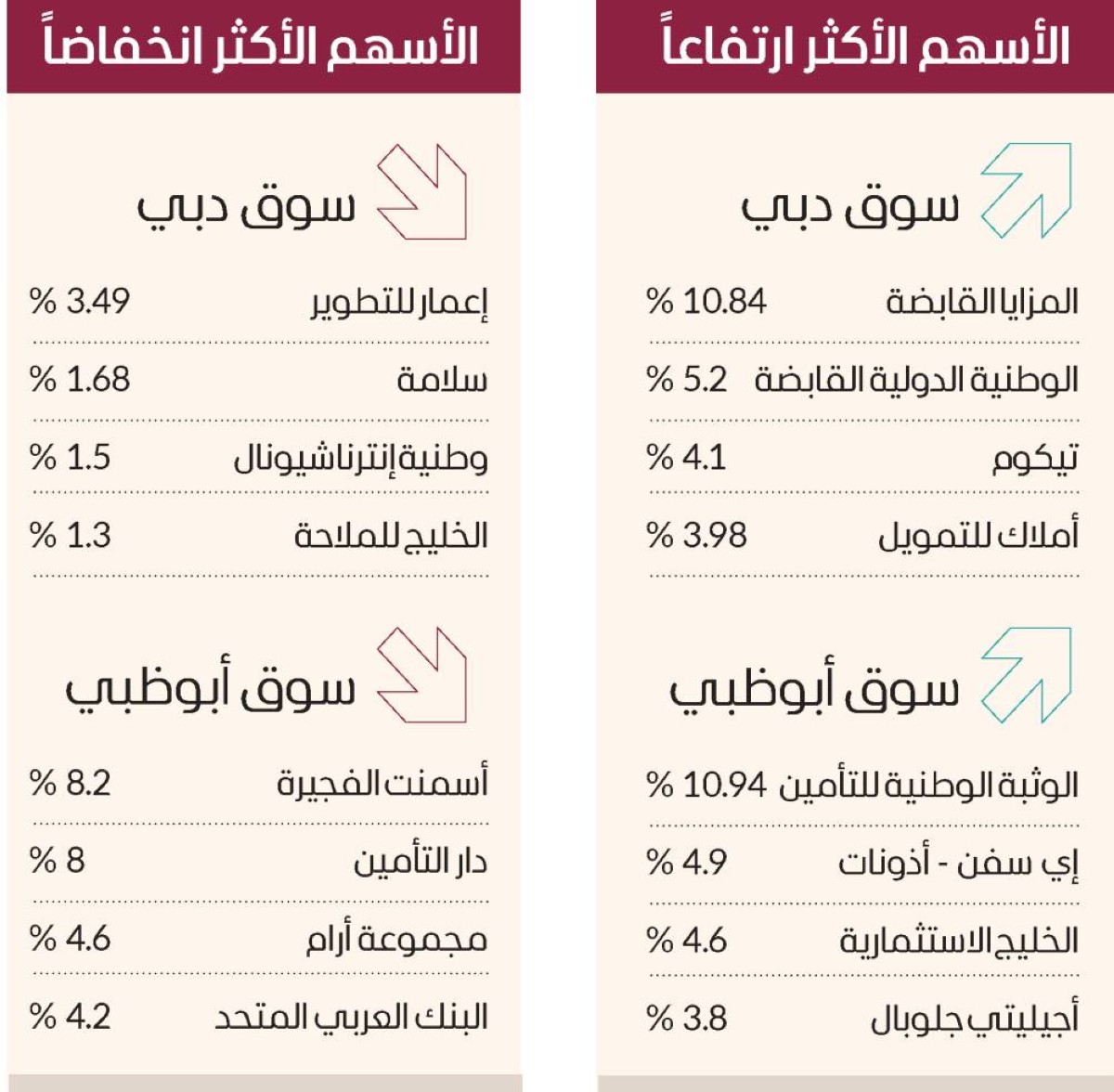 في المقابل، انخفضت أسهم أسمنت الفجيرة 8.2%، ودار التأمين 8%، ومجموعة أرام 4.6%، والبنك العربي المتحد 4.2%.