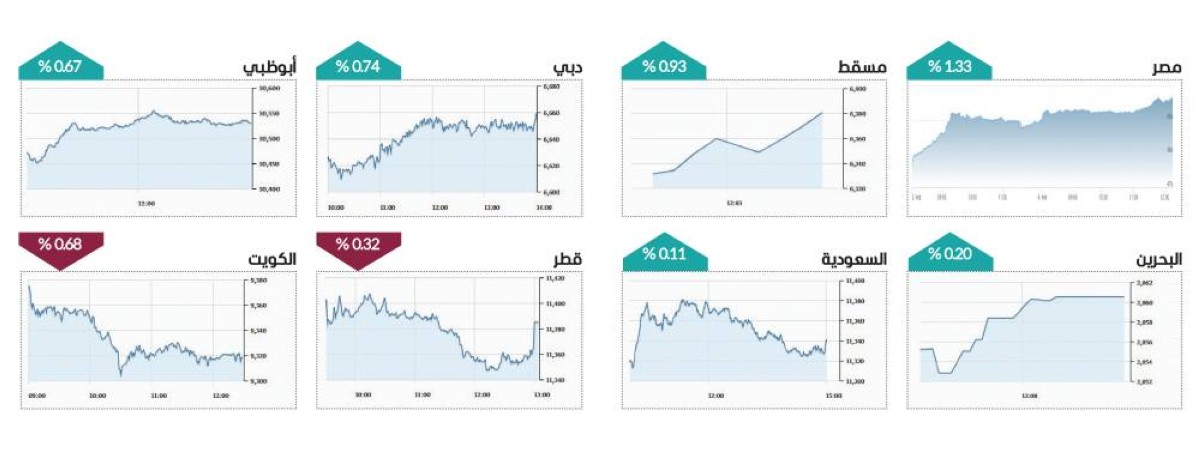 وشهدت أغلب مؤشرات البورصات العربية ارتفاعاً في الأداء، إذ ارتفع «تاسي» السعودي 0.11%، ومسقط 0.93%، والبحرين 0.20%، فيما تراجعت بورصتا الكويت 0.68%، وقطر 0.32%، وخارج منطقة الخليج، صعد مؤشر بورصة مصر 1.33%.