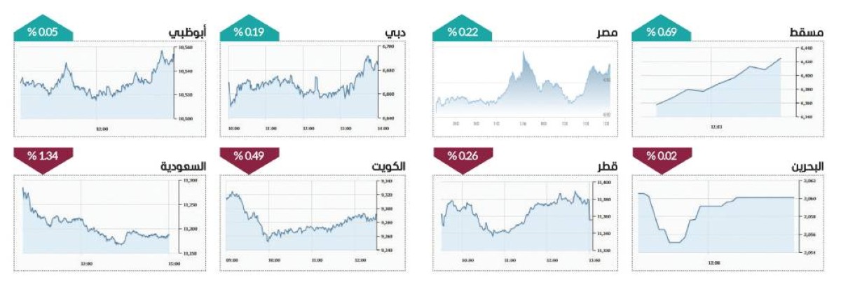 وشهدت مؤشرات البورصات العربية تبايناً في الأداء، إذ تراجع «تاسي» السعودي 1.34%، والكويتي 0.49%، والقطري 0.26%، والبحرين 0.02%، فيما ارتفعت بورصة مسقط 0.69%، وخارج منطقة الخليج، صعد مؤشر بورصة مصر 0.22%.