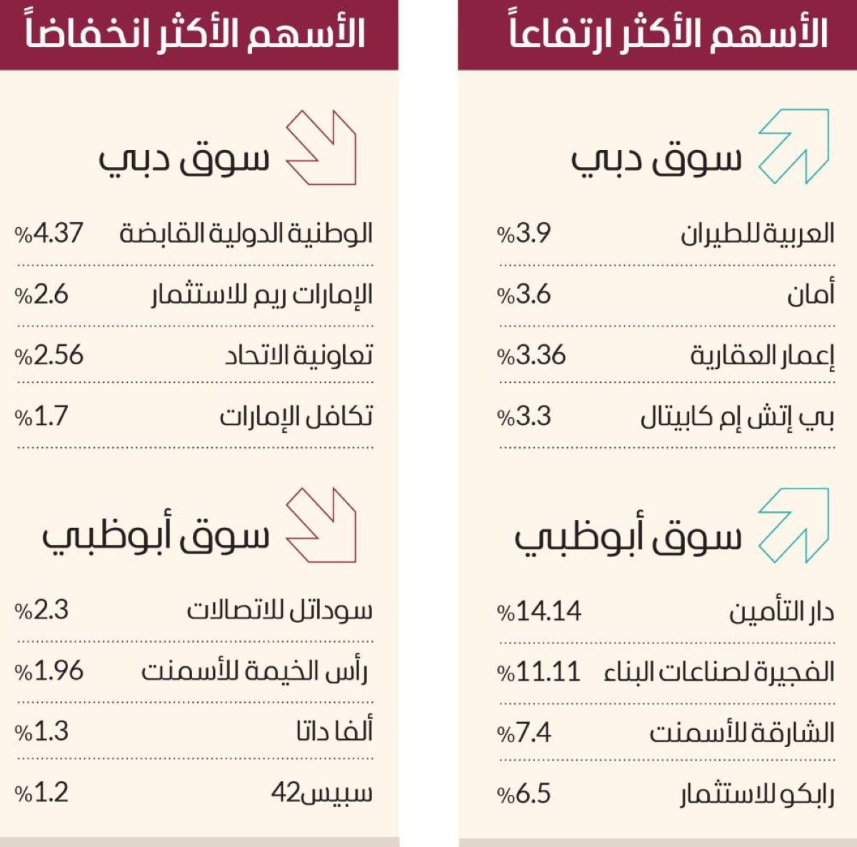 وارتفعت في سوق أبوظبي أسهم دار التأمين 14.14% بالحد الأقصى، والفجيرة لصناعات البناء 11.11%، والشارقة للأسمنت 7.4%، ورابكو للاستثمار 6.5%.