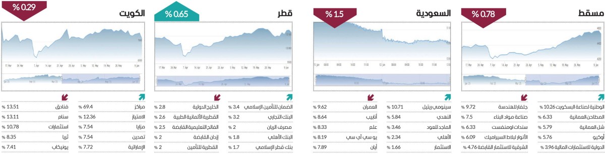 وفي الدوحة، سجل مؤشر البورصة القطرية مكاسب خلال الجلسات الثلاثة التي تلت عطلة عيد الأضحى المبارك، مرتفعاً بنسبة 0.65% (أكثر من 68 نقطة)، مُنهياً التعاملات عند مستوى 10626.5 نقطة.