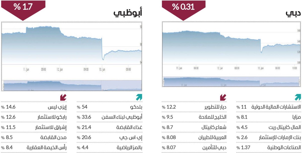 وفي جلسة نهاية الأسبوع، قلصت مؤشرات دبي وأبوظبي تراجعاتها التي بدأت عليها على وقع التطورات الجيوسياسية في المنطقة، ليغلق مؤشر سوق دبي المالي على انخفاض 1.8% وسوق أبوظبي للأوراق المالية بانخفاض 1.3%، وشهدت الجلسة صفقات قوية ناهزت 62.3 ألف صفقة، بإجمالي تداولات نحو 3 مليارات درهم.