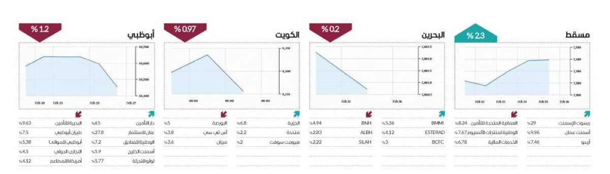 سيطر الحذر على أداء البورصات العربية خلال الأسبوع الأخير من فبراير، وغلب التراجع على أغلب الأسواق، فيما خالف مؤشر بورصة مسقط الاتجاه.