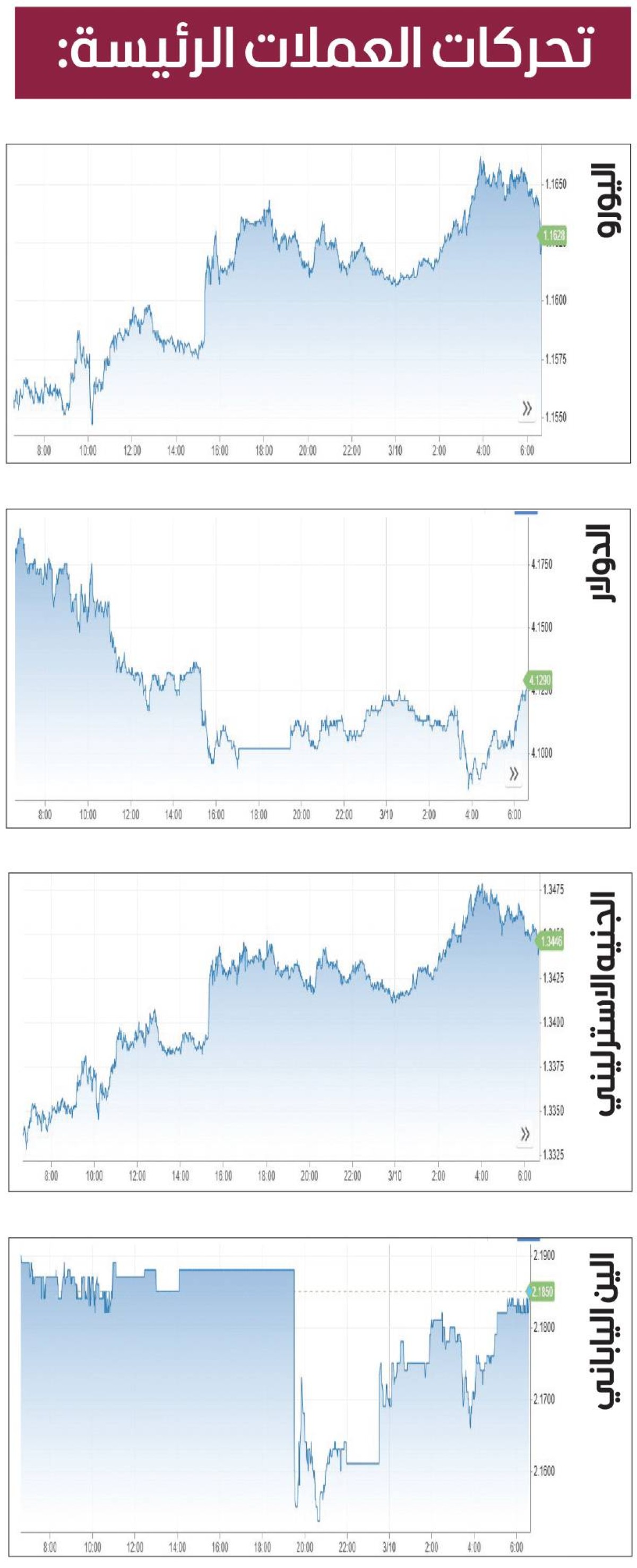 وبلغ سعر الدولار 157.73 يناً و1.1632 مقابل اليورو في بداية التداول الآسيوي، لكنه تراجع عن أعلى مستوياته في اليوم السابق بعد أن قال الرئيس الأمريكي دونالد ترامب لشبكة (سي. بي. إس. نيوز)، إن واشنطن «متقدمة جداً» في الحرب على إيران عن تقديره الأولي الذي كان يتراوح بين أربعة وخمسة أسابيع.