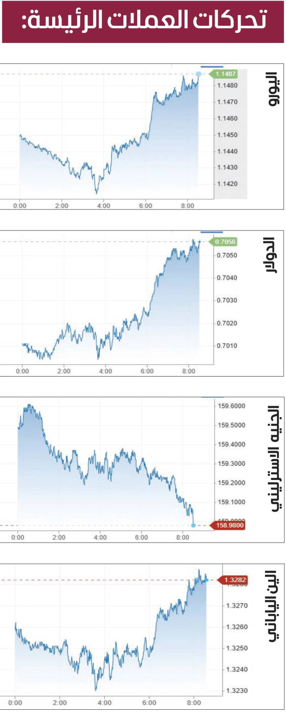 وقالت كارول كونج، محللة العملات لدى بنك (كومنولث أستراليا): «تشكل الحرب مخاطر هبوطية على النمو الاقتصادي ومخاطر صعودية على التضخم، لذا ستعتمد استجابة البنوك المركزية إلى حد كبير على أحدث سياق، وتحديداً ما إذا كان التضخم أعلى من المستوى المستهدف أم عنده أم أقل منه». وقبل الاجتماعات، تخلى الدولار عن بعض المكاسب القوية التي حققها الأسبوع الماضي، مما جعل اليورو ينتعش من أدنى مستوياته في سبعة أشهر ونصف الشهر المسجل في وقت سابق من الجلسة ليجري تداوله مرتفعاً 0.2 بالمئة عند 1.1440 دولار. وارتفع الجنيه الاسترليني 0.23 بالمئة إلى 1.3253 دولار، لكنه لم يبتعد عن أدنى مستوياته في ثلاثة أشهر ونصف الشهر والذي سجله يوم الجمعة، إذ شهد انخفاضاً أسبوعياً بلغ 1.5 بالمئة.