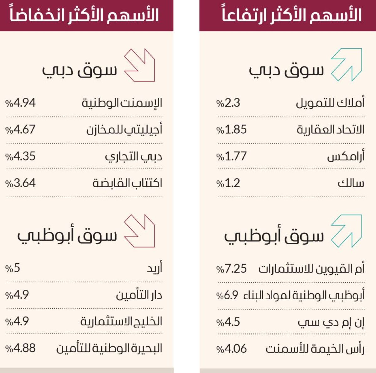 وكان ضمن الأسهم المرتفعة في سوق أبوظبي، أسهم أم القيوين للاستثمارات 7.25%، وأبوظبي الوطنية لمواد البناء 6.9%، وإن إم دي سي 4.5%، ورأس الخيمة للأسمنت 4.06%.