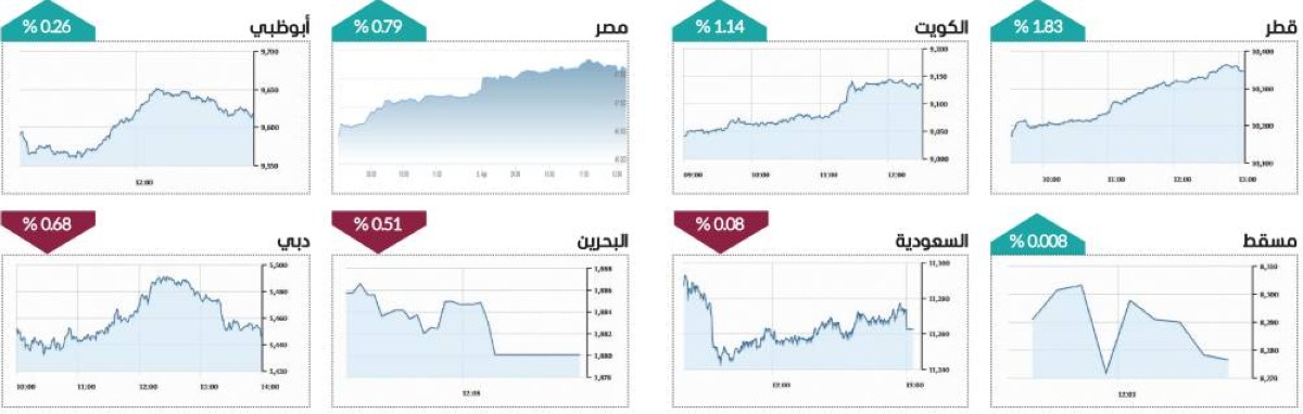 وشهدت أغلب مؤشرات البورصات العربية ارتفاعاً في الأداء، إذ ارتفعت بورصات قطر 1.83%، والكويت 1.14%، ومسقط 0.008%، في حين تراجع المؤشر السعودي «تاسي» 0.08%، والبحرين 0.51%، وخارج منطقة الخليج صعد مؤشر بورصة مصر 0.79%.
