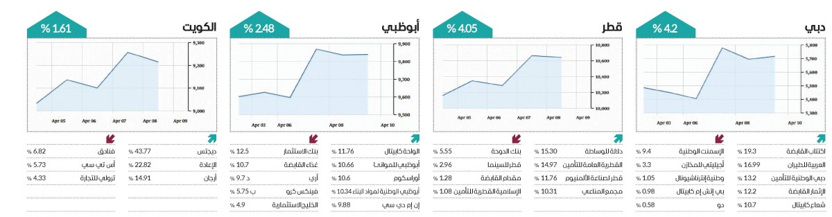 وتفاعلت الأسهم العربية مع تلك التطورات بشكل إيجابي، ليفرض اللون الأخضر هيمنته على شاشات التداول فيما يخص الأداء الأسبوعي لأبرز المؤشرات، وسط تباين في أحجام السيولة.