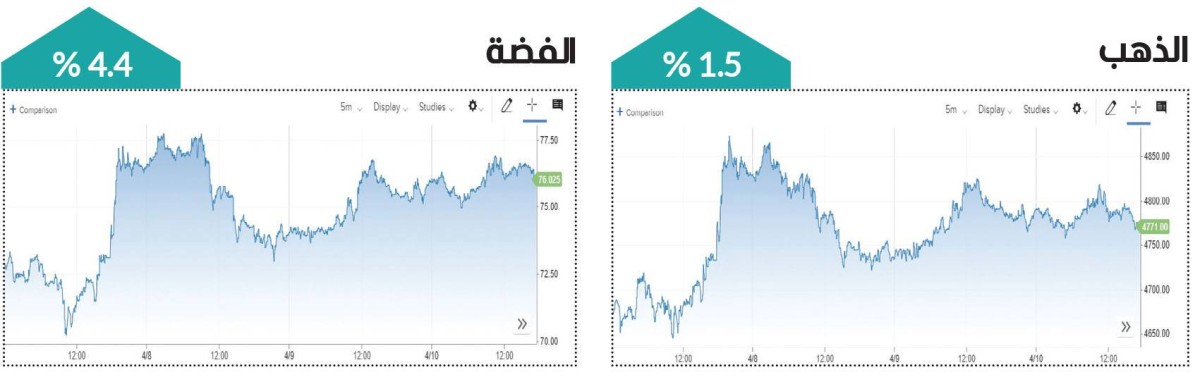 سجلت أسعار الذهب مكاسب أسبوعية، وسط ترقب المستثمرين مآلات الهدنة الحالية بين الولايات المتحدة وإسرائيل وإيران، وتداعيات التطورات الراهنة في المنطقة على اتجاهات الفيدرالي الأمريكي بخصوص الفائدة. وارتفع الذهب في المعاملات الفورية إلى 4748 دولاراً للأونصة تقريباً، بمكاسب أكثر من 1.5% هذا الأسبوع. وبلغت العقود الآجلة للذهب الأمريكي نحو 4804 دولارات. كذلك ارتفعت أسعار الفضة من 72.9 دولاراً للأوقية في نهاية الأسبوع قبل الماضي إلى 76.7 دولاراً بنهاية الأسبوع الماضي بارتفاع نسبته 4.4%. ويظل مسار أسعار الذهب مرهوناً بدرجة كبيرة باتجاهات أسعار الفائدة، إذ إن المعدن الأصفر، بوصفه أصلاً لا يدر عائداً، يفقد جزءاً من جاذبيته في بيئة الفائدة المرتفعة التي تعزز بدورها قوة الدولار وترفع تكلفة الفرصة البديلة للاحتفاظ به.