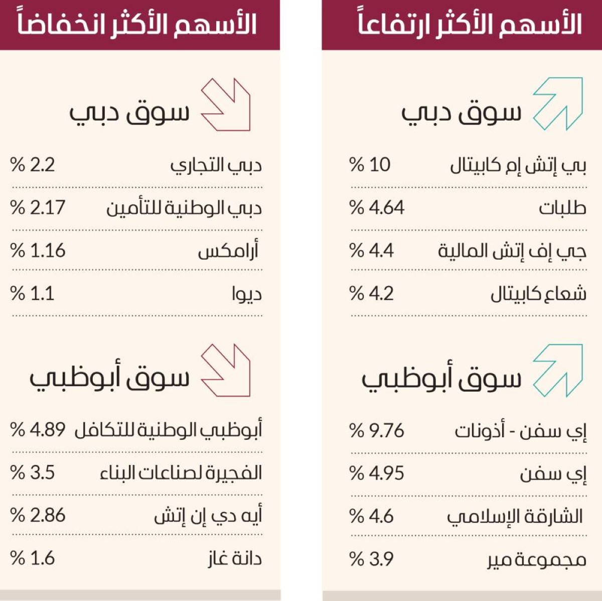 وارتفعت في سوق أبوظبي أسهم إي سفن - أذونات 9.76%، وإي سفن 4.95%، والشارقة الإسلامي 4.6%، ومجموعة مير 3.9%. وفي المقابل، تراجعت أسهم أبوظبي الوطنية للتكافل 4.89%، والفجيرة لصناعات البناء 3.5%، وأيه دي إن إتش 2.86%، ودانة غاز 1.6%.