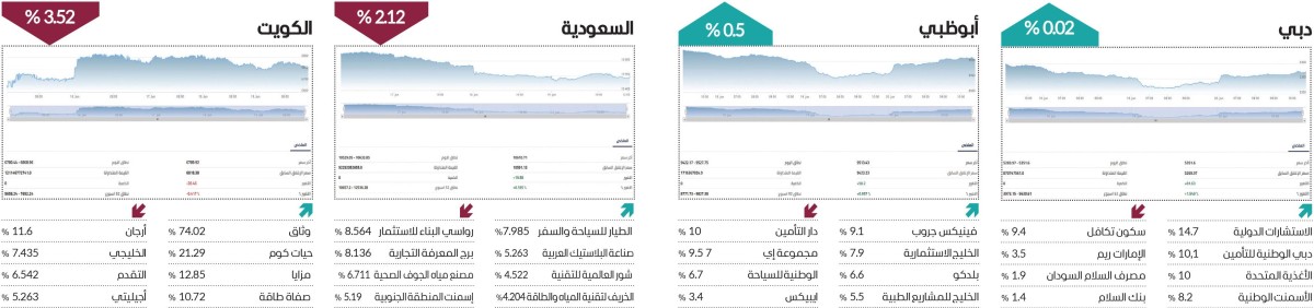 وكانت أسواق المال في الإمارات الأقل تأثراً عربياً، حيث كان مؤشر سوق دبي الأقل على الإطلاق بتباطؤ طفيف بنسبة 0.2% عن إجمالي الأسبوع المنقضي مقارنة بمستواه البالغ 5364.6 نقطة بختام تداولات الأسبوع الماضي، فيما تقلص مؤشر سوق أبوظبي المالي بنسبة 0.5% مقارنة بمستوى 9564 نقطة بإغلاق جلسات التداول الأسبوع الماضي.