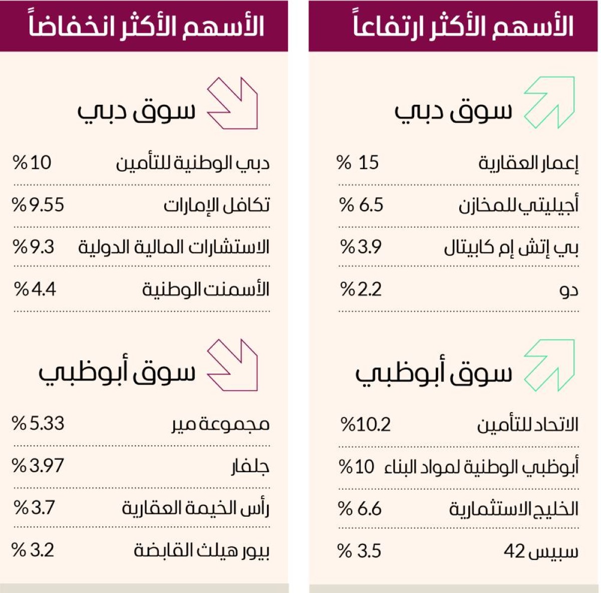 وصعدت في سوق أبوظبي أسهم «اﻻتحاد للتأمين» 10.2%، و«أبوظبي الوطنية لمواد البناء» 10%، و«الخليج اﻻستثمارية» 6.6%، و«سبيس 42» بنسبة 3.5%.