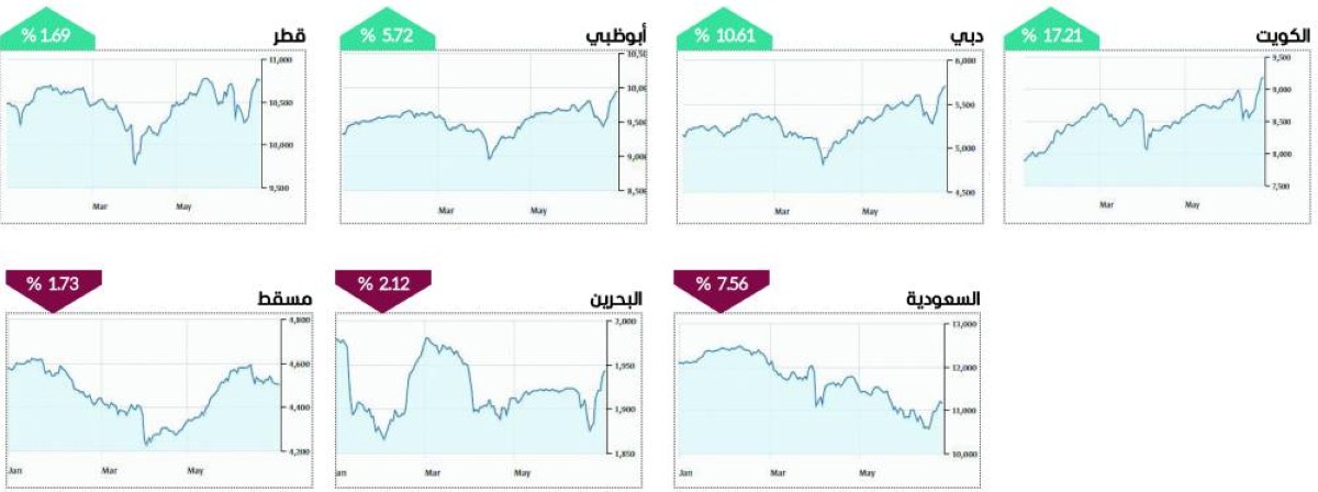 وخلال 6 أشهر، ارتفعت بورصة الكويت 17.21%، وقطر 1.69%، مقابل تراجع بورصات السعودية 7.56%، والبحرين 2.12%، ومسقط 1.73%.