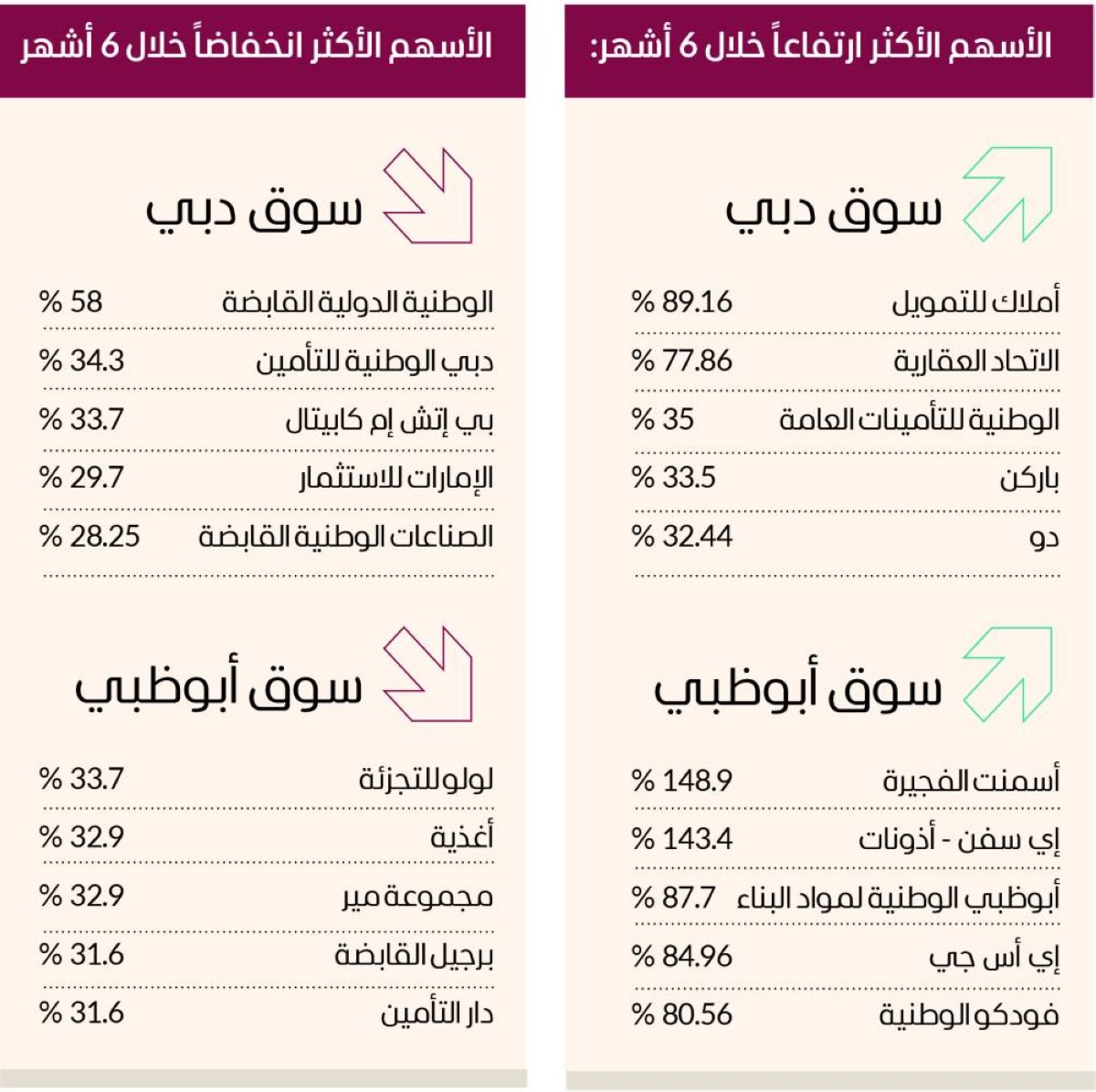 وتصدر سهم «أملاك للتمويل» ارتفاعات سوق دبي بنمو 89.16%، فيما صعدت أسهم الاتحاد العقارية 77.86%، والوطنية للتأمينات العامة 35%، وباركن 33.5%، ودو 32.44%، والإمارات الإسلامي 31.04%، ودبي الإسلامي 27.9%، وأرامكس 26.8%، والاستشارات المالية الدولية 23.7%، ودبي التجاري 20.06%.