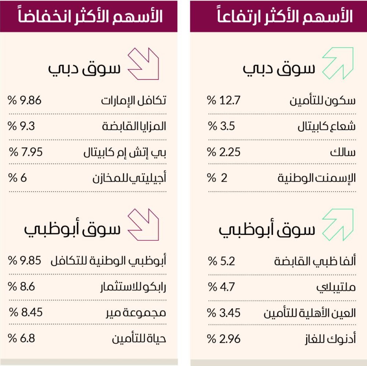 وتصدر سهم «سكون للتأمين» ارتفاعات 20 سهماً في سوق دبي مرتفعا 12.7%، وفي المرتبة الثانية من حيث السيولة، جاء سهم «الإمارات دبي الوطني» بـ119.2 مليون درهم ليقفل عند مستوى 20.15 درهماً.