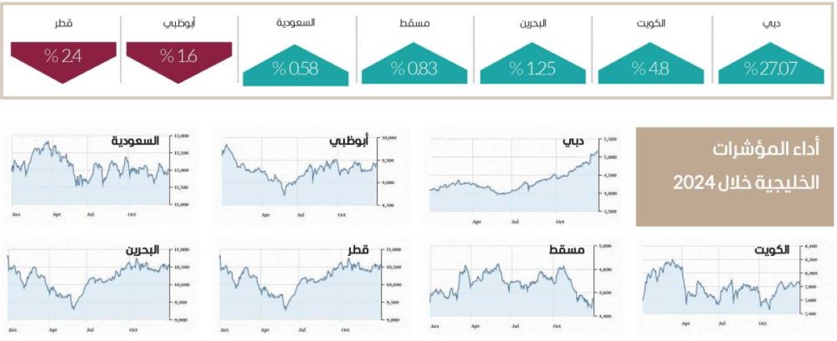 وقاد سوق دبي صعود معظم مؤشرات أسواق الخليج التي شهدت أغلبها ارتفاعاً في الأداء خلال عام 2024، حيث ارتفعت بورصات الكويت 4.8%، والبحرين 1.25%، ومسقط 0.83%، والسعودية 0.58%، مقابل تراجع قطر 2.4%.
