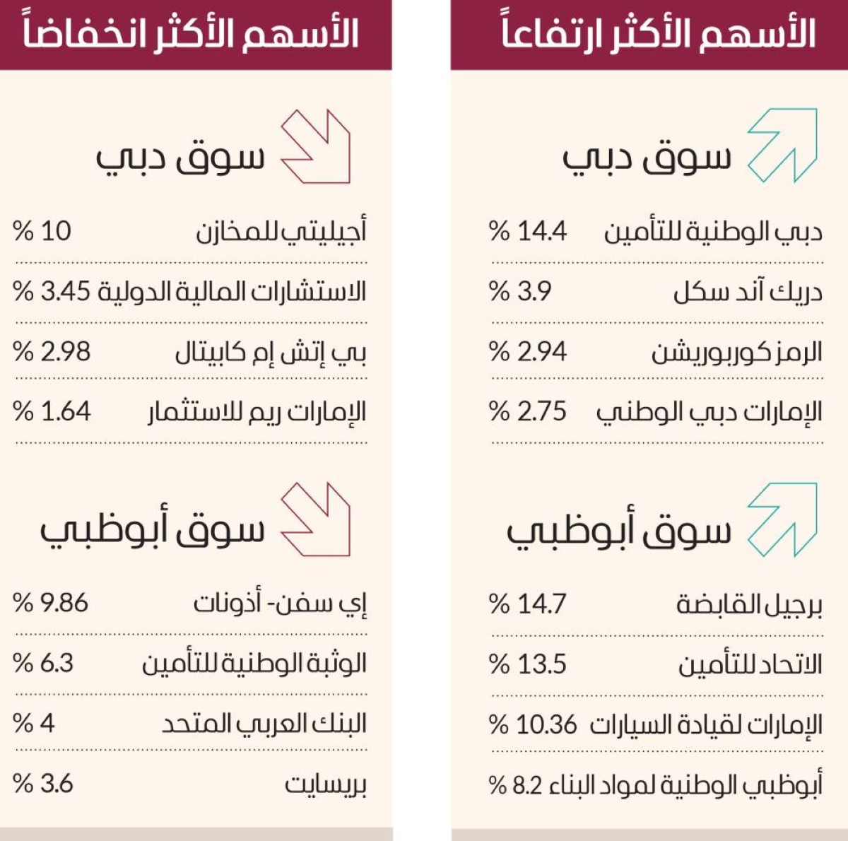 وصعدت أسهم برجيل القابضة 14.7%، واﻻتحاد للتأمين 13.5%، والإمارات لقيادة السيارات 10.36%، وأبوظبي الوطنية لمواد البناء 8.2%، وانخفضت أسهم إي سفن- أذونات 9.86%، والوثبة الوطنية للتأمين 6.3%، والبنك العربي المتحد 4%، وبريسايت 3.6%.