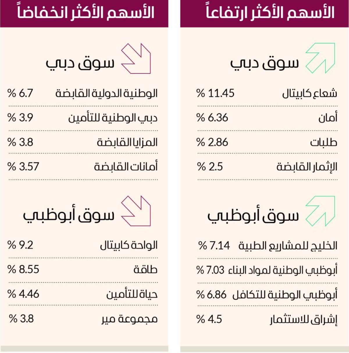 وكان ضمن الأسهم المرتفعة في سوق أبوظبي، أسهم «الخليج للمشاريع الطبية» 7.14 %، و«أبوظبي الوطنية لمواد البناء» 7.03 %، و«أبوظبي الوطنية للتكافل» 6.86 %، و«إشراق للاستثمار» 4.5 %. وارتفع سهم «ايزي ليس لتأجير الدراجات النارية» بالنسبة القصوى 15 % عند 37.5 درهماً، بينما انخفض سهم «ملتيبلاي» بنسبة 3.4 % عند درهمين، وبتداولات قاربت 28 مليون سهم، وانخفض سهم «أبوظبي للفنادق» بنسبة