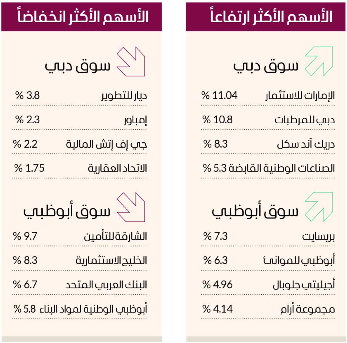 وكان ضمن الأسهم الرابحة في سوق أبوظبي، أسهم بريسايت 7.3 %، وأبوظبي للموانئ 6.3 %، وأجيليتي جلوبال 4.96 %، ومجموعة أرام 4.14 %، في المقابل، تراجعت أسهم الشارقة للتأمين 9.7 %، والخليج اﻻستثمارية 8.3 %، والبنك العربي المتحد 6.7 %، وأبوظبي الوطنية لمواد البناء 5.8 %.