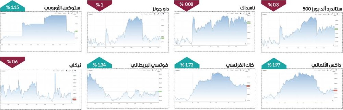 وبالنسبة للأسهم الأوروبية فقد أسهمت خسائر جلسة نهاية تعاملات الأسبوع، يوم الجمعة، في تقليص نسبة المكاسب الأسبوعية، لترتفع المؤشرات الرئيسية بنسبة 1 % في المتوسط، مع ترقب الأسواق للتطورات المرتبطة بحرب الرسوم الجمركية، التي أطلقها الرئيس الأمريكي دونالد ترامب.