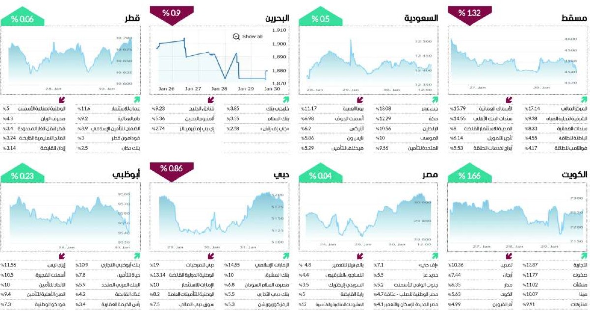 سجلت الأسواق العربية أداءً متبايناً خلال الأسبوع الأخير من يناير الماضي، إذ تفاوتت المؤشرات بين الصعود والتراجع في ظل تحركات المستثمرين وترقب التطورات الاقتصادية العالمية.