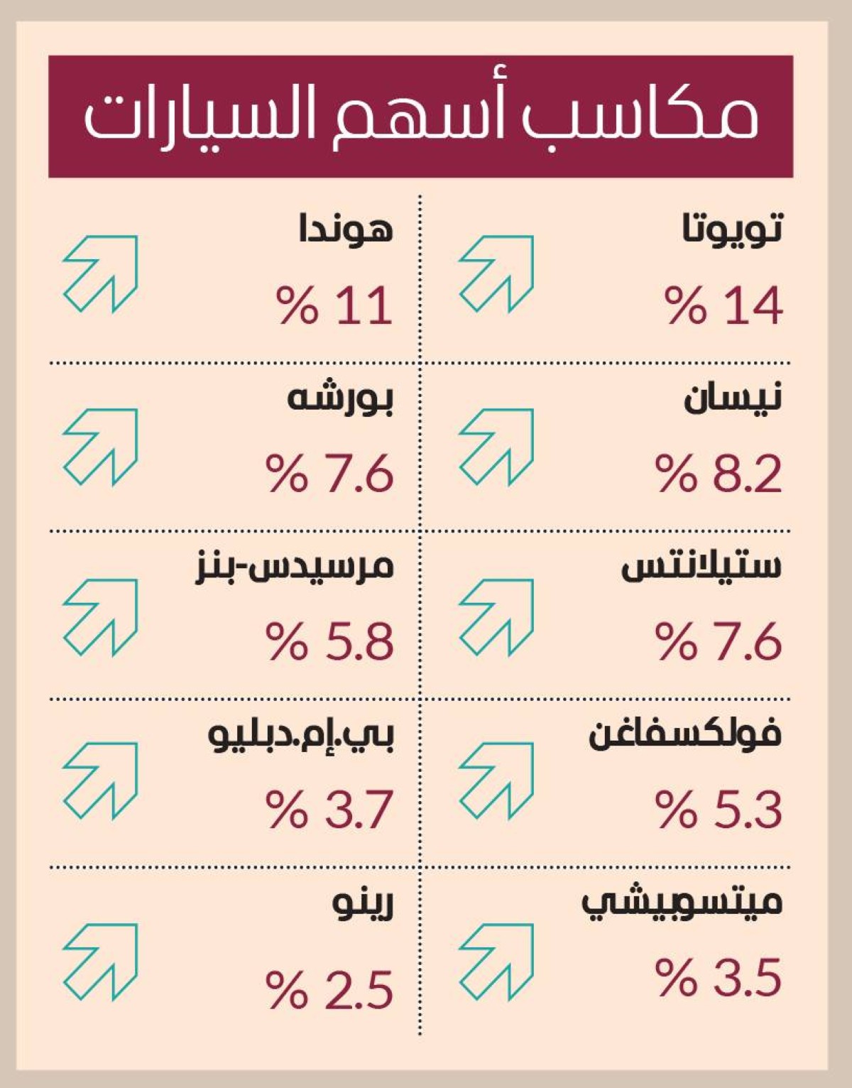 وصعد سهم بورشه 7.6 % وسهم مرسيدس-بنز 5.8 %، كما ارتفع سهم بي.إم.دبليو 3.7% وفولكسفاغن 5.3%، ورينو 2.5%، وستيلانتس 7.6%.